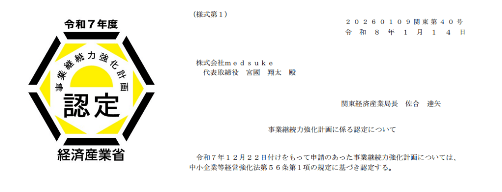 株式会社medsukeは、経済産業省の「事業継続力強化計画」の認定を受けました。